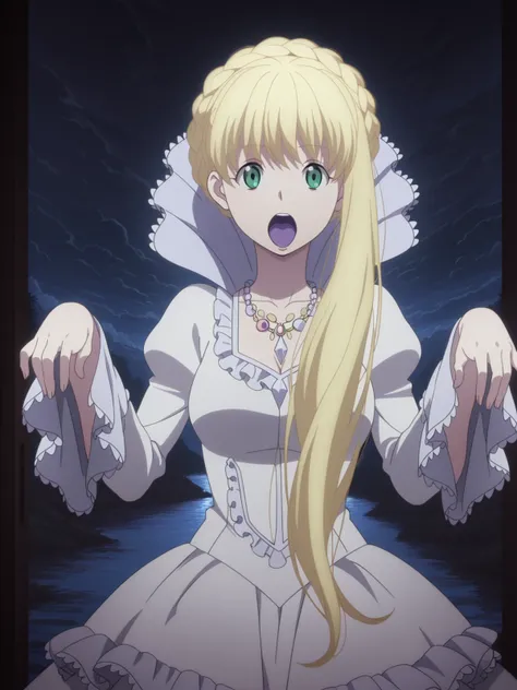 <lora:ghost-pose-illustriousxl-lora-nochekaiser:1>, ghost pose, ghost, purple tongue, open mouth, tongue, hands up, indoors, night, night sky, dark, horror (theme), cloud, dark cloud, dim lighting, dark room, backlighting, cowboy shot
