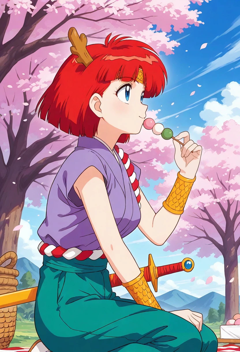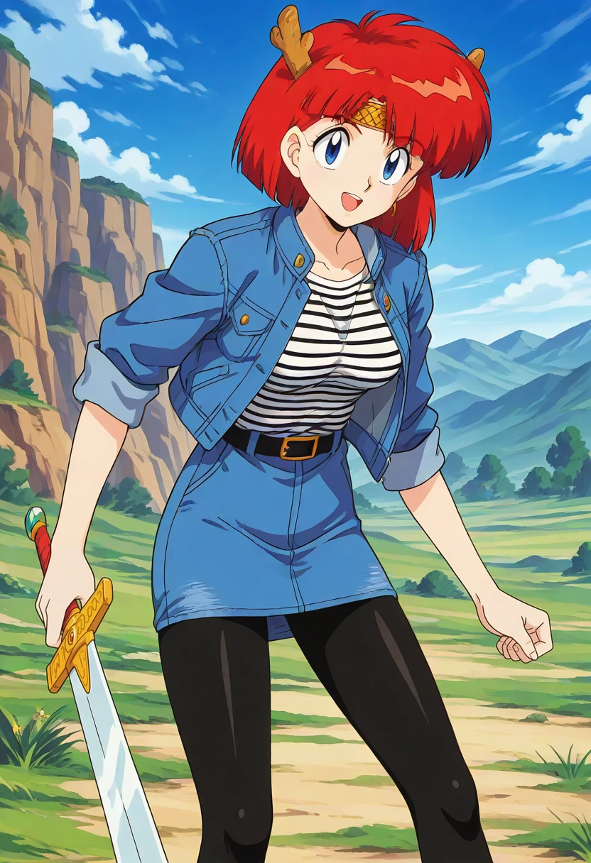 gs_mikami_shoryukiretro artstylered hair, short hair, horns, bangs, blue eyes, headband, single earringshoryuki_costume, japanese clothes, bracer, short sleeves, green pants, ropeshoryuki_denim, black pantyhose, blue jacket, blue short skirt, white and black striped shirt, black belt, long sleeves, sleeves rolled upsword, sheathed, yellow sheath