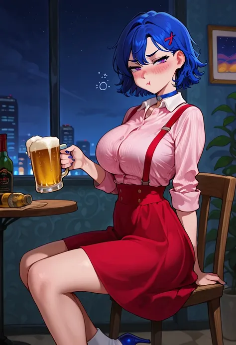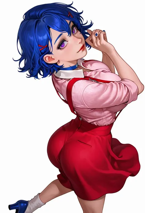 <lora:3m1ly_sdv:1>emily_sdv, blue hair, short hair, red lipstick, violet eyes, red hairclip, blue choker, large breasts,buttoned shirt, pink shirt, white collar, rolled up sleeves, red suspenders, red skirt,white socks, blue high heels,painted nails, nail polish, blue nails,