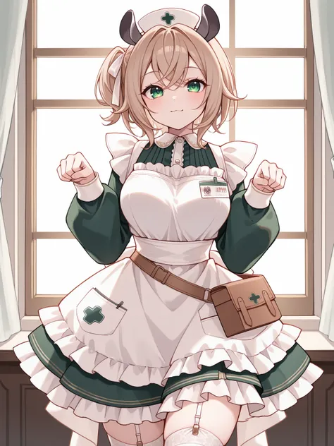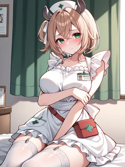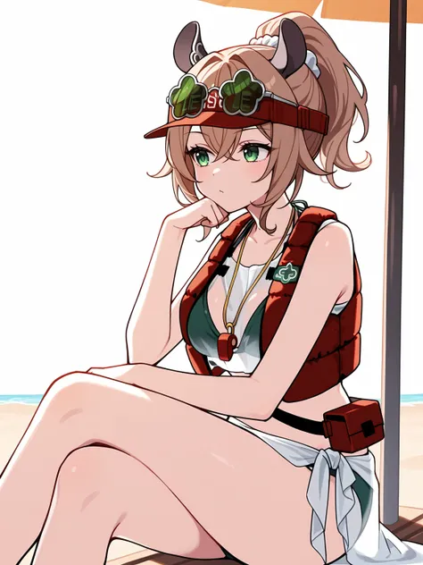 vtnimi, green eyes, short hair, brown hair, one side up, white hair ribbon, tapir ears, medium breasts, nurse cap, green dress, collared dress, puffy long sleeves, white apron, id badge, waist bag, white thighhighs, garter straps, frilled apron, frilled dressvtnimi, green eyes, short hair, brown hair, ponytail, white scrunchie, tapir ears, medium breasts, green bikini, see-through tank top, crop top, bikini under clothes, red vest, life vest, visor cap, sunglasses on head, flower sunglasses, whistle around neck, red waist bag, white sarong