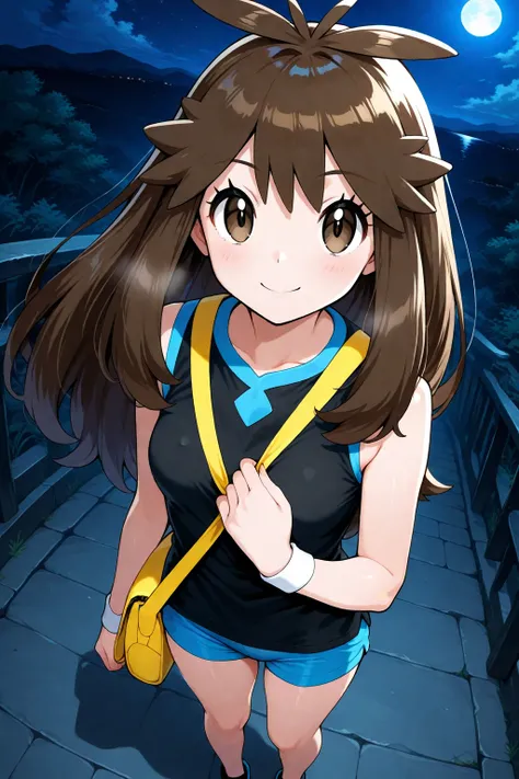 lgpegreen, green \(pokemon\), brown eyes, eyelashes, long hair, bangs, brown hair, sidelocks, black shirt, sleeveless shirt, blue shorts, short shorts, shoes, black footwear, bare legsshoulder bag, yellow bag