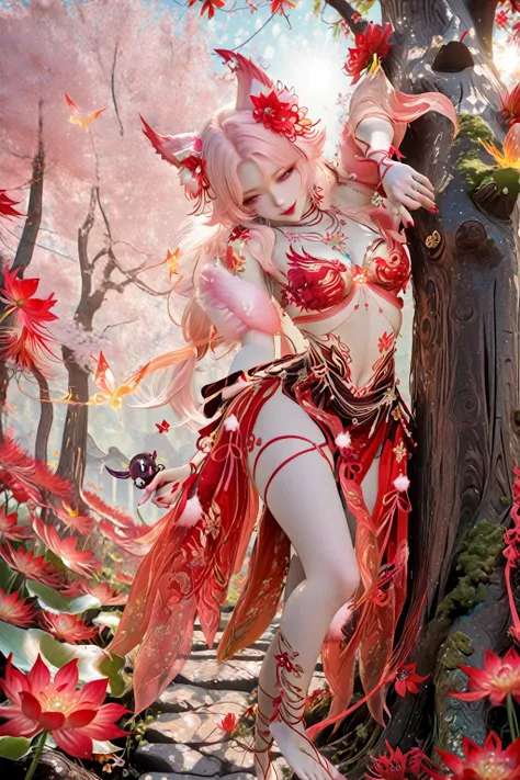yulinglong,1girl,jewelry,earrings,barefoot,red nails,anklet,nail polish,fox ears,animal ear fluff,cleavage,flower tattoo,lotus,ribbon,sheer fabric,midriff,(red dress:0.7),navel,