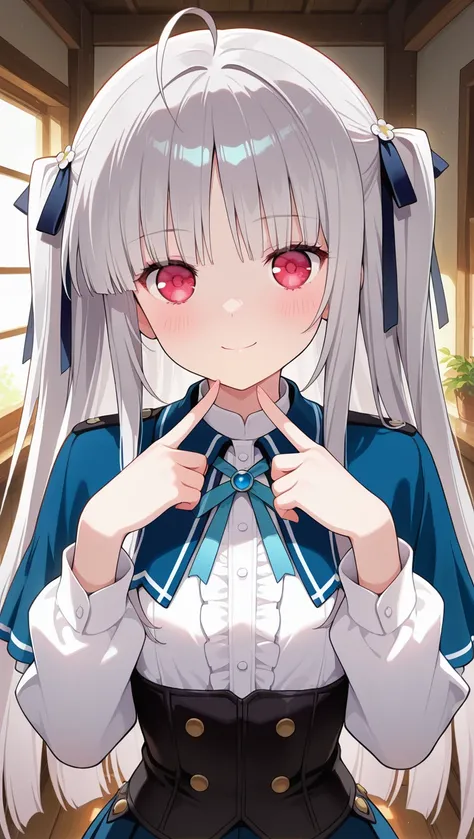 Julie Sigtunaahoge,very long hair,grey hair,black hair ribbon,two side up,sidelocks,blunt bangs,fuchsia eyesblue capelet,neck ribbon,blue ribbon,white shirt,center frills,long sleeves,black corset,buttons,blue skirt,pleated skirt,frills,black thighhighs,zettai ryouiki,mary janes,black footwear(petite:1.2)
