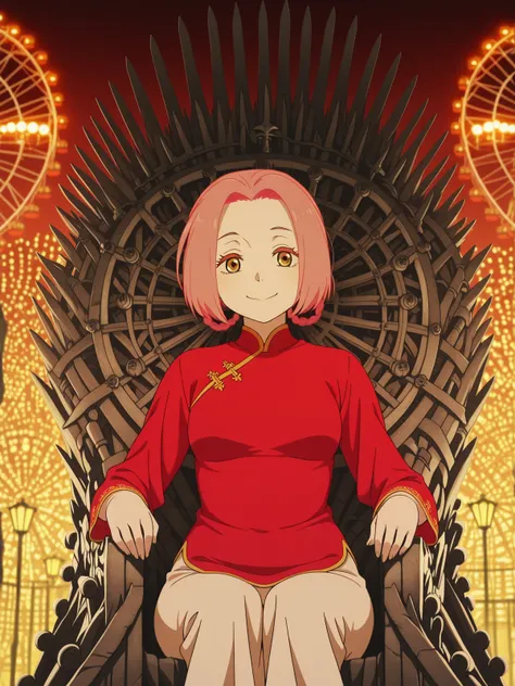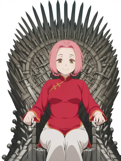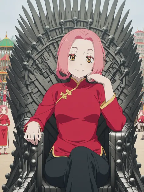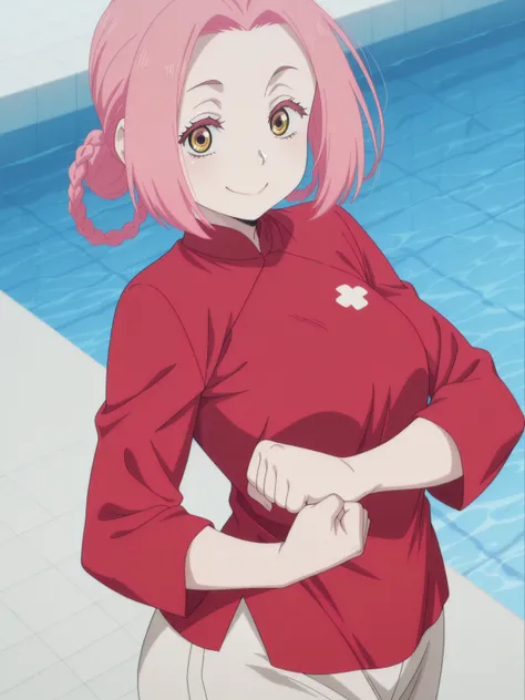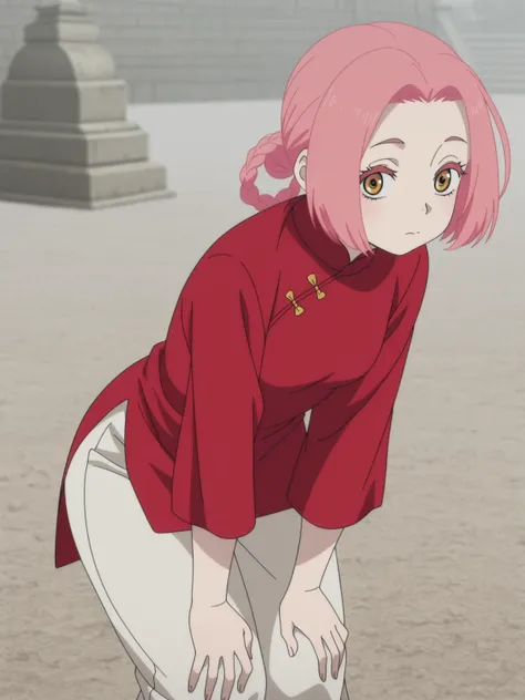 mei, short hair, pink hair, hair rings, parted bangs, braid, yellow eyes, mature female, small breasts, anime screencappants, red shirt, chinese clothes, long sleeves