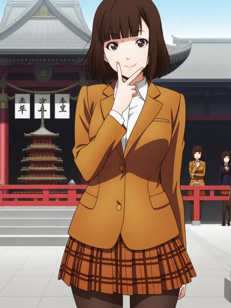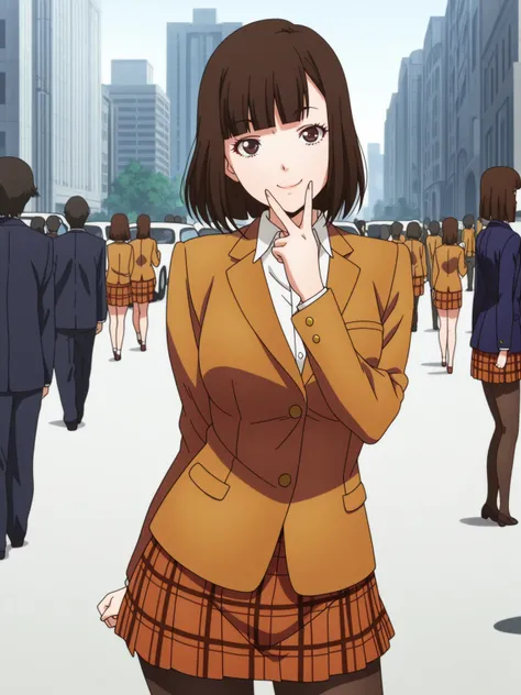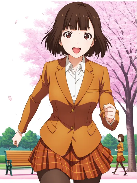 chiyo kurihara, brown hair, brown eyes, short hair, bangs, blunt bangs, mature female, medium breasts, anime screencapskirt, jacket, pantyhose, plaid, plaid skirt, blazer,