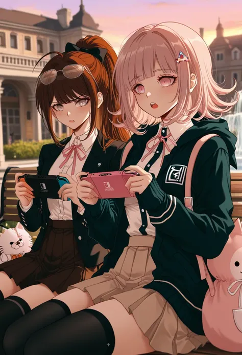 1girl, kana_(criis-chan), ahoge,black-framed_eyewear,black_dress,black_shoes,bow,collared_dress,criis-chan,dress,eyewear_on_head,glasses,gloves,grey_eyes,hair_bow,hand_up,long_hair,pink_hair,ponytail,shoes,short_sleeves
