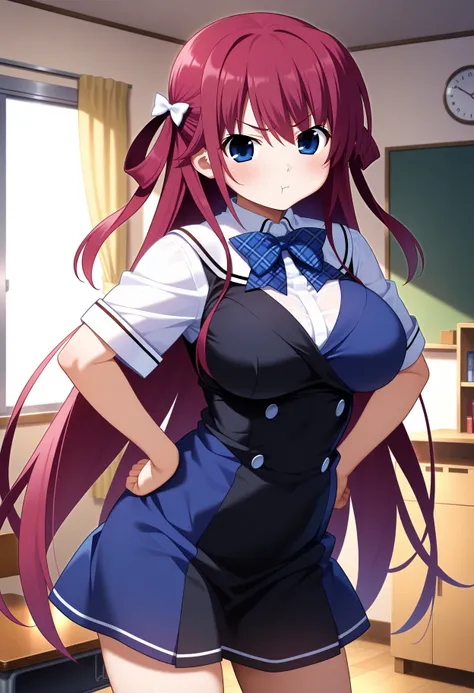 aaamane, long hair, red hair, hair rings, hair bow, blue eyes, breasts, school uniform, plaid bowtie, white shirt, black dress, blue dress, short sleevesaaamane, long hair, red hair, hair rings, hair bow, blue eyes, breasts, bare shoulders, cleavage, white camisole, cross-laced clothes, white belt, midriff, jeans, black pants
