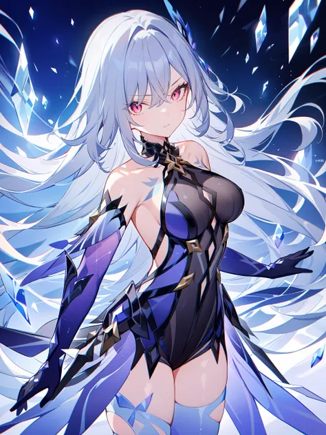 skirk \(genshin impact\)butterfly hair ornament, prosthetic leg, prosthetic arm, multicolored cape, winged high heels, white halter dress, arm cuffs, chest tattoobutterfly hair ornament, prosthetic leg, prosthetic arm, faulds, winged high heels, black halter leotard, arm armor, chest tattoo