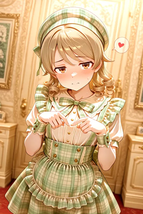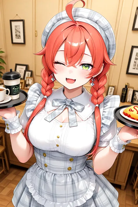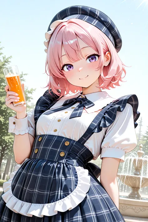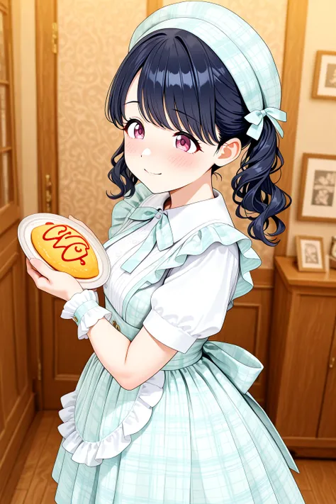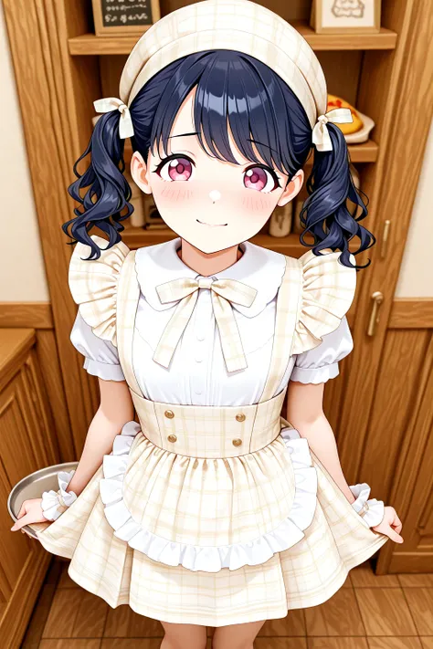 Idol_Checkered_Maid_Dress, white shirt, skirt, high-waist skirt, plaid dress, checkered clothes, gingham, plaid headwear, beret, short puffy sleeves, wrist cuffs, bow, apron, frills, bowtie, checkered ribbon, buttonscolor dress