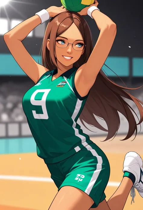 althea kagawa, long hair, parted bangs, forehead, brown hair, striking light silver eyes, glasses, tan skin. medium breast, long straight brown hair, light silver eyes, teeth smile