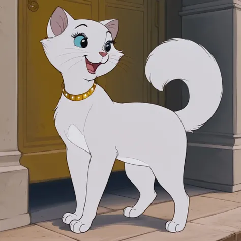 duchess, female, cat, disney, turkish angora, light grey-white fur, light white belly, blue sclera, gold jeweled collar