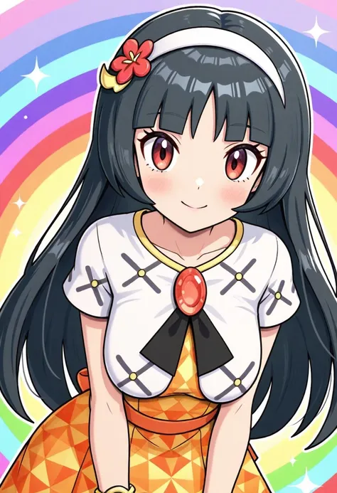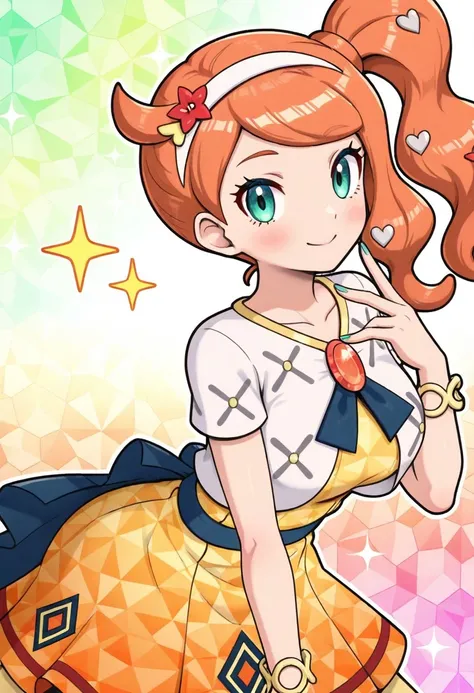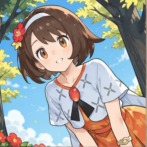 annigloria, aged up, gloria \(pokemon\), brown hair, brown eyes, short hair,jewelry, hairband, hair flower, red flower, brooch, cropped jacket, white jacket, short sleeves, orange dress, layered dress, medium dress, single bracelet, gold bracelet, shoes, mary janes, orange footwear