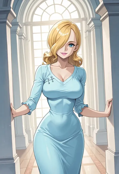 VinsmokeSoraOP, 1girl, solo, pale skin, long hair, blonde hair, curly hair, hair over one eye, dark blue eyes, full lips, pink lipstick, makeup, large breast, long dress, light blue dress, dress ornament, elbow length sleeves, cleavage, collarbone, thick thighs, frills, barefoot,