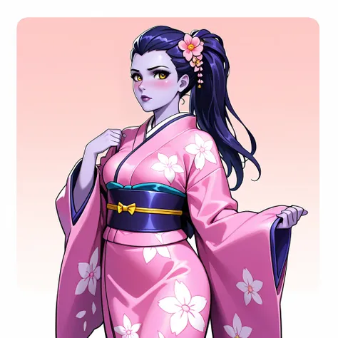 WidowMaker, 1girl, breasts apart, widowmaker (overwatch), colored skin, pink bodysuit, center opening, head-mounted display, yellow eyes, blue hair, purple lips, plunging neckline, ponytail, large breasts, hair pulled back, collarbone, thigh gap, nose, makeup, navel, lipstick, gloves, cleavage, skin tightWidowMakerBikini, 1girl, widowmaker (overwatch), solo, medium breasts, arm tattoo, official alternate costume, swimsuit, eyewear on head, purple skin, navel, sunglasses, front-tie bikini top, colored skin, jewelry, yellow eyes, hair pulled back, sarong, front-tie top, ponytail, long hair, cleavage, bracelet, blue bikini, purple hair, purple lips, earrings, short sleeves, nose, collarbone, white choker, makeup