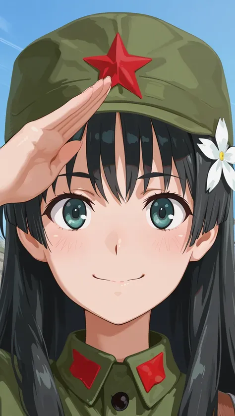 Saten Ruikocasual clothes no.1long hair,black hair,hair ornament,hair flower,sidelocks,bangs,black eyesbare shoulders,camisole,white shirt,frilled shirt,medium breasts,dark blue pants,capri pants,pants rolled up,sandals,red footwear