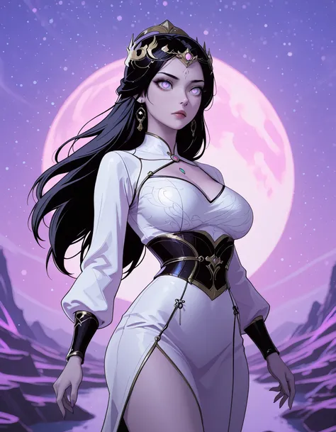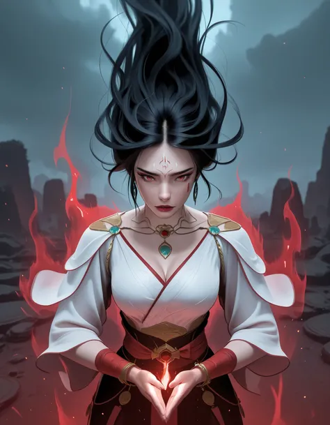 hongdie1girl, jewelry, long hair, solo, black hair, earrings, red eyes, hair ornament, dress, hongdie, renegade immortal, fantasy girl, facial mark, upturned eyes, chinese clothes, graceful, xian ni, elegant, xianxia1girl, long hair, black hair, earrings, fantasy girl, facial mark, hanfu, forehead mark, fur trim, expressionless, blood, purple eyes, two-tone dress, blood from mouth
