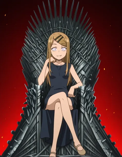 saya endou, long hair, blonde hair, hair ornament, brown eyes, hairclip, fang, wide-eyed, constricted pupils, sanpaku, mature female, small breasts, anime screencapskirt, shirt, hair ornament, jacket, pleated skirt, socks, blazer,