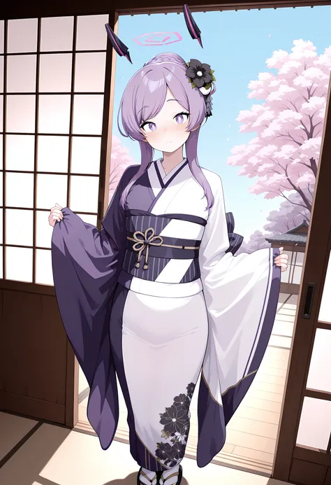 ut4def, purple hair, long straight hair, purple eyes, white pupils, pink halo, floating headgear, black sweater, white collared shirt, medium breasts, blue necktie, black gloves, two-tone gloves, white pleated skirt, brown pantyhose, black loafers,ut4cap, purple hair, long hair, high ponytail, purple eyes, white pupils, pink halo, floating headgear, blue hachimaki, hair ribbon, black and blue coat, two-tone coat, medium breasts, buttons, white collared shirt, open collar, blue armband, white tasuki, back ribbon, white pants, black lace-up boots, knee boots, white gloves,ut4idol, purple hair, short hair, braided bun, swept bangs, purple eyes, white pupils, pink halo, floating headgear, hair flower, black flower, hair ornament, purple kimono, white kimono, two-tone kimono, long wide sleeves, obi, obijime, obiage, floral print, white tabi, black okobo, platform sandals,ut4cap, purple hair, long hair, high ponytail, purple eyes, white pupils, pink halo, floating headgear, cheerleader, medium breasts, cleavage, white detached collar, purple name tag, purple sports bra, two-tone sports bra, criss-cross halter, purple skirt, two-tone skirt, high-waist pleated skirt, midriff, navel peek, bare legs, white sneakers,id_card,microphone, holding microphone, singing, musical note,yellow pom pom \(cheerleading\), holding pom poms, cheering,
