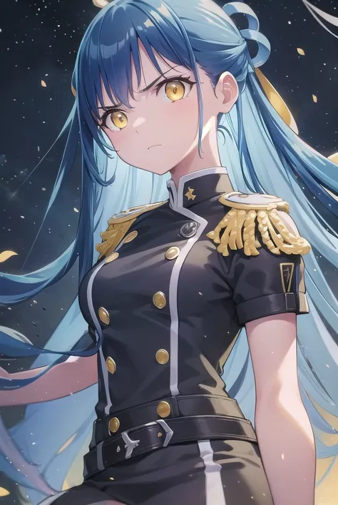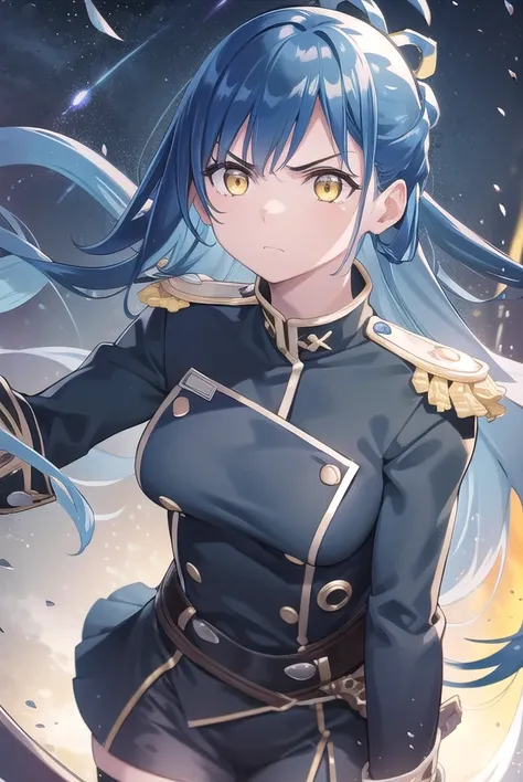 himari azuma, long hair, hair rings, (blue hair:1.5), (yellow eyes:1.3),