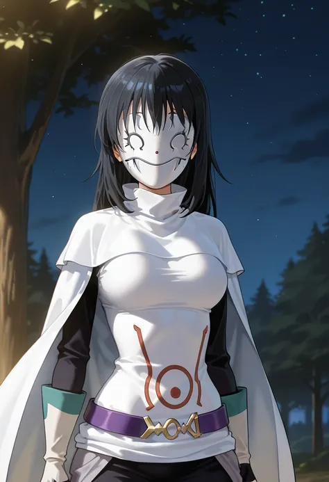 EBShizue1girl, solo, long hair, black hair, hair between eyes, medium breasts, parted lips, black eyes, facial mark, straight hair, long sleeves, white shirt, white gloves, fingerless gloves, black pants, white cape, loose belt, purple belt, black gloves,