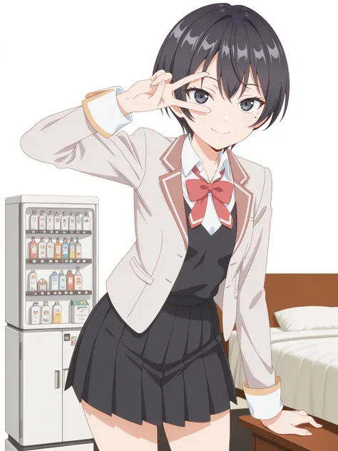 chisaki sarashina, black eyes, black hair, mole, mole under eye, short hair, mature female, small breasts, anime screencapshirt, bow, jacket, white shirt, collared shirt, bowtie, red bow, blazer, red bowtie, black skirt, pleated skirt,