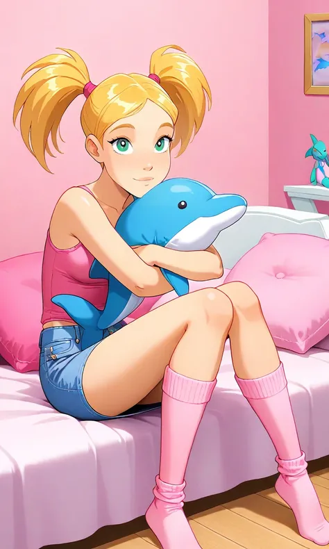 1girl,twintails,blonde hair,green eyes,pink tank top,denim skirt