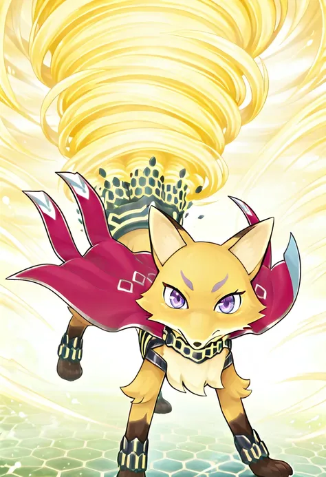 majes_fox,majes_fox,solo,purple eyes,animal,fox,red cape,no humans,full body,honeycomb (pattern),
