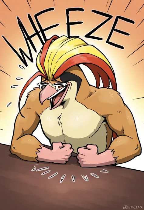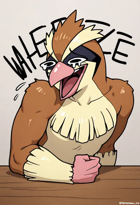 wheeze, upper body, laughing, tears, clenched hand, crying, english text, hand on table, open mouth