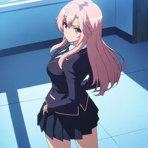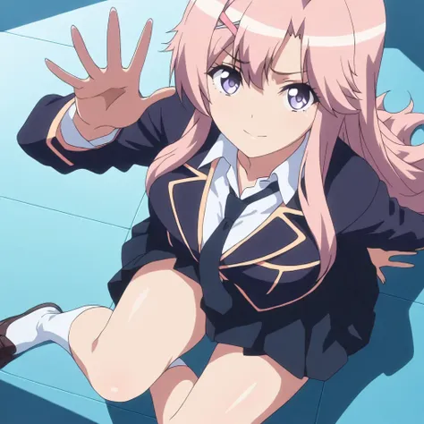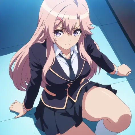 kanako, pink hair, long hair, hairclip, purple eyesschool uniform,necktie,skirt,socks