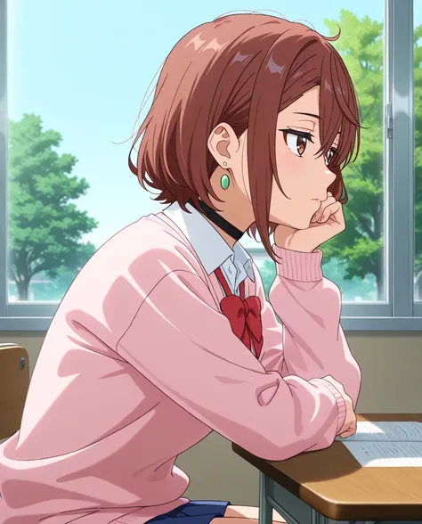 <lora:momo_ayase-dandadan_s1-ixl-anime-soralz:1>, momo ayase (dandadan), brown hair, short hair, hair between eyes, asymmetrical bangs, brown eyes, earrings, black chokerschool uniform, white collared shirt, pink sweater, long sleeves, red bowtie, blue skirt, miniskirt, white socks, loose socks, brown footwearalt school uniform, black blazer, long sleeves, black pants, white sockscasual outfit, collarbone, bra strap, off-shoulder shirt, bare shoulders, long sleeves, black skirt, black miniskirt, sneakers