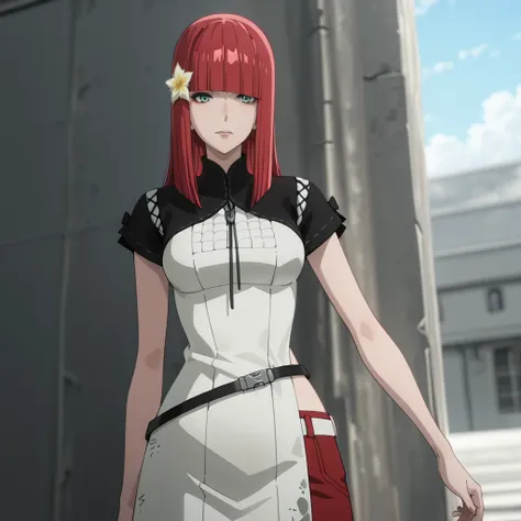 Devola, 1girl, red hair, star hair ornament, star (symbol), medium breasts, dress, green eyes, long hairPopola, 1girl, red hair, hair ornament, dress, long hair, hair flower, green eyes, belt, bangs, cowboy shotDevolaCloak, 1girl, red hair, hair flower, hair ornament, cloak, backpack, green eyes, cowboy shotPopolaCloak, 1girl, hair ornament, hair flower, red hair, blunt bangs, long hair, cloak, grey eyes, cowboy shot