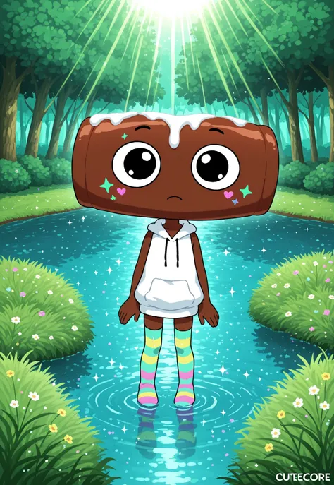 cosmo, object_head, food creature, swiss_roll head, (brown skin), white icing on head, green aqua and magenta star-shaped cheek freckles, big eyes, black eyes, white sleeveless hoodie, black drawstrings, magenta aqua and green striped thighhighs, striped_legweardark-skinned male
