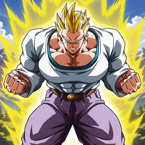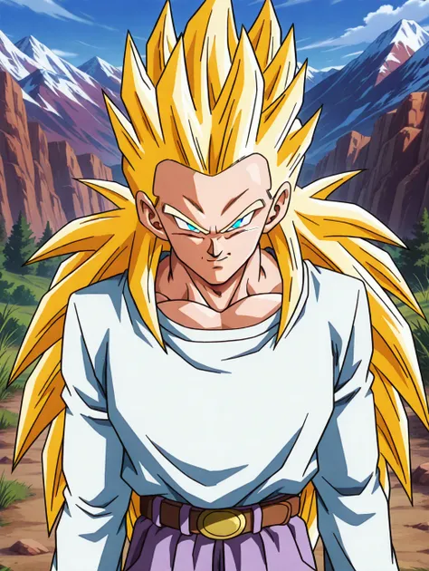 SSGTGoten,1boy,spiked hair,tilted hair,yellow hair,super saiyan,blue eyes,white long sleeved shirt,long sleeves,lavender chino pants,beige brown boots,solo,