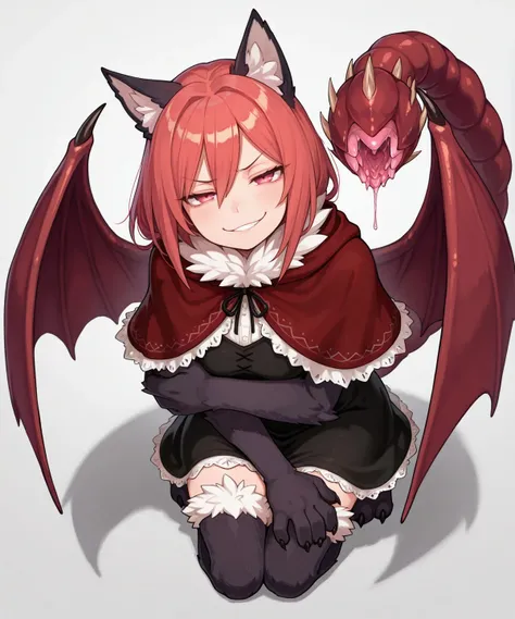 Manticore, pink eyes, red hair, animal-ears, white mane, black fur, forearm-fur, leg-fur_thighhigh, animal hands, animal feet, leathery wings, red wings, wing-spikes, segmented tail, red tail, tail-pussy, tail open, black bikini, bikini-heart, broochJabberwock, red eyes, multicolored hair, pink hair, dark pink hair, head-fins_wavy, gradient horns, dark pink horns to pink horns, wavy horns, wavy scales, forearm-scales, leg-scales_kneehigh, scaled hands, scaled feet, leathery wings, two-tone wings, dark pink wings, red wing-webbing, smooth tail, dark pink tail, multiple tails, tail-mouth, extra mouth, extra tongue, tail open, argyle clothing, elaborate clothing, tongue-tie