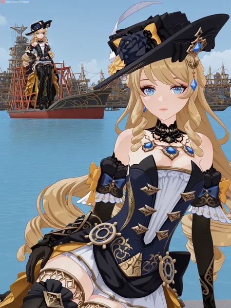 navia, navia (genshin impact), long hair, blue eyes, blonde hair, drill hair, mature female, breasts, 3d,gloves, hat, dress, jewelry, flower, detached sleeves, black gloves, elbow gloves, black headwear, hat flower, hat feather,
