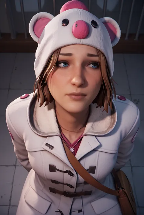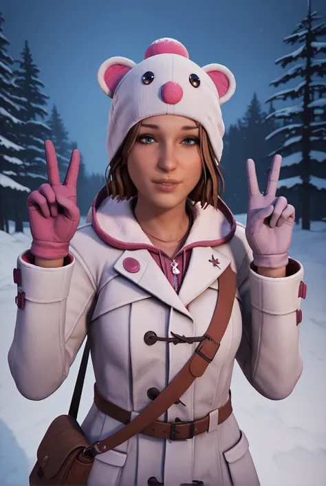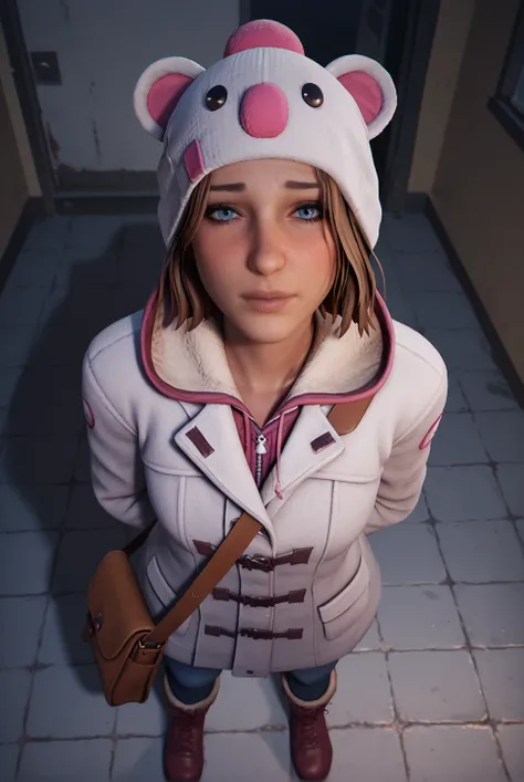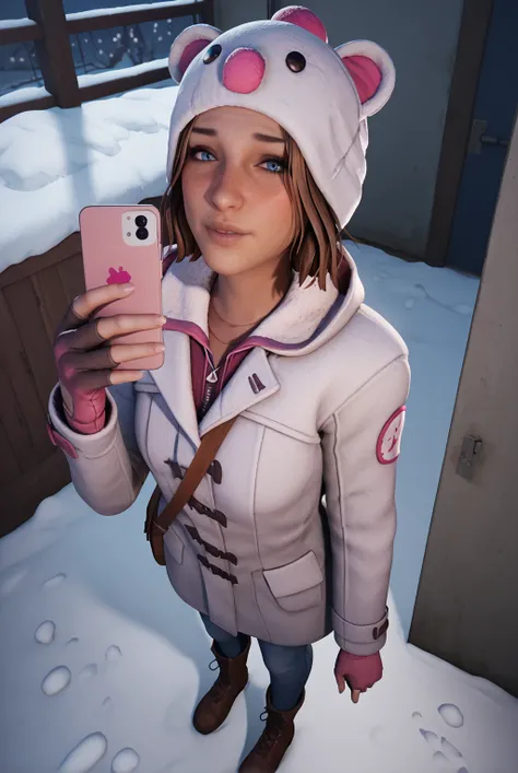 max caulfieldshort hair, blue eyes, brown hair, freckleslong sleeves, gloves, animal ears, fake animal ears, white headwear, hood down, white coat, shoulder bag, winter clothes, animal hat, winter, pink gloves, hooded coat, winter coat, duffel coat, pants, boots