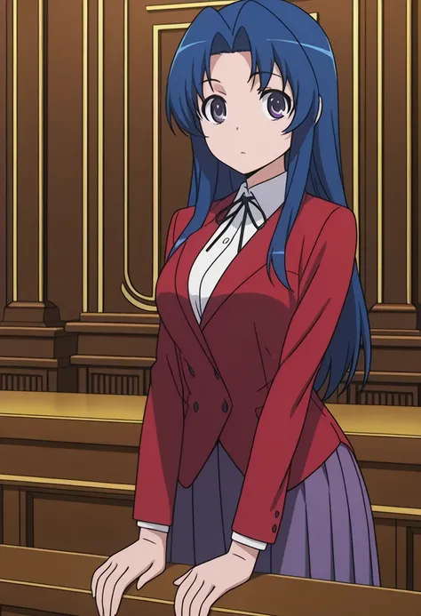 ami kawashima, long hair, blue hair, purple eyes, parted bangs, mature female, medium breasts, anime screencapjacket, red jacket, long sleeves, shirt, white shirt, collared shirt, ribbon, skirt, pleated skirt,