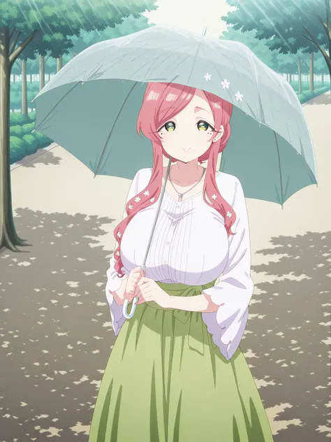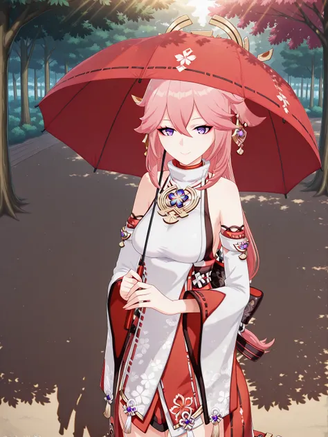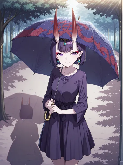 <lora:getsuyoubi-no-tawawa-385-illustriousxl-lora-nochekaiser:1>, getsuyoubinotawawa 385, looking at viewer, smile, holding, standing, outdoors, solo, umbrella, holding umbrella, sunlight, shadow, tree, tree shadow