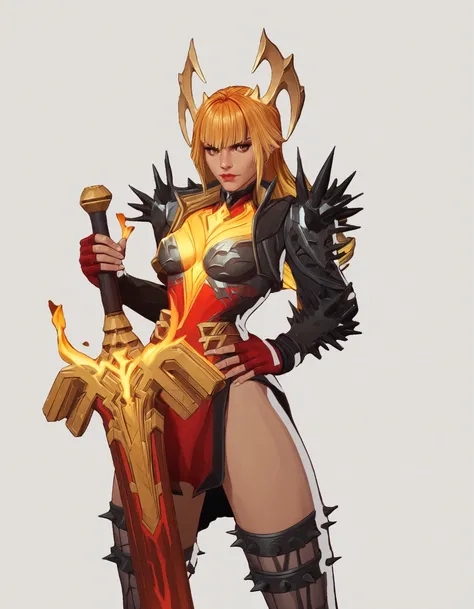 Magik,X-Men Outfit,blonde hair, bangs, fringe, blue yellow uniform, spandex bodysuit, gold crown, black collar, black pauldrons, yellow gauntlets, red belt, x belt buckle, yellow thigh straps, yellow boots,holding giant sword,