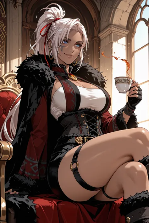 aran, dark-skinned female, very long hair, white hair, french braid, hair ribbon, ponytail, hoop earrings, blue eyes, scar on face, facial mark, fur-trimmed cape, collared halterneck, white bustier, cleavage, wide sleeves, fur-trimmed sleeves, fingerless gloves, brooch, fur-trimmed corset, black belt, belt buckle, black miniskirt, thigh strap, multiple thigh straps, o-ring thigh strap, fur-trimmed knee boots, high heelsHolding axe