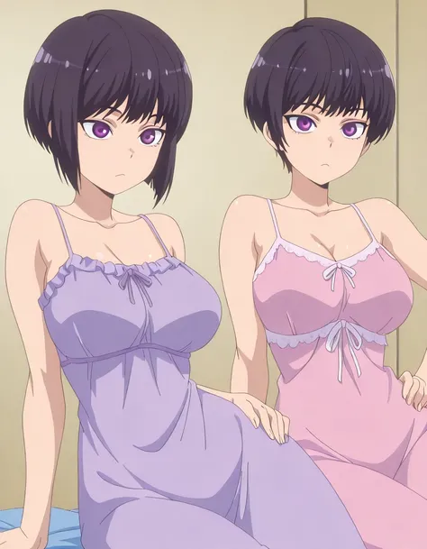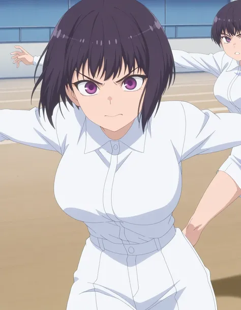 hana sunomiya, short hair, bangs, black hair, purple eyes, crop cut, mature female, breasts, anime screencapshirt, bow, white shirt, collared shirt, bowtie, red bow, red bowtie, jacket, blazer, skirt, blue skirt,
