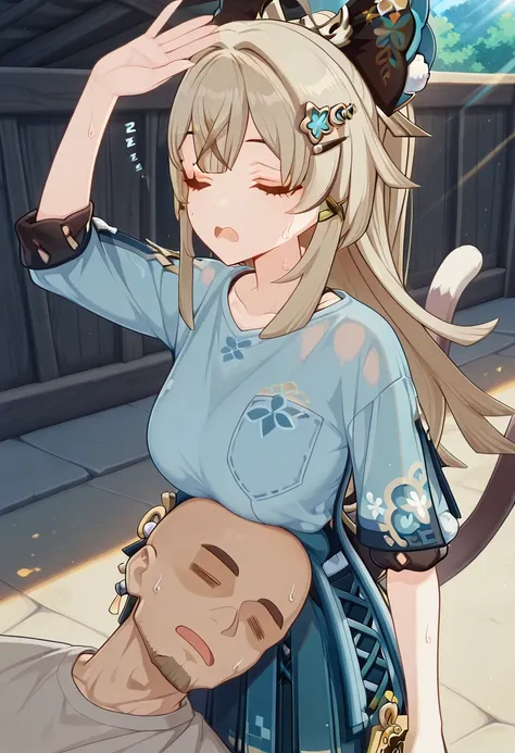 kirara, kirara (genshin impact), long hair, brown hair, hair ornament, animal ears, green eyes, tail, ahoge, sidelocks, hairclip, cat ears, cat tail, light brown hair, cat girl, multiple tails, two tails, nekomata, mature female, small breasts, 3dskirt, long sleeves, bare shoulders, pleated skirt, detached sleeves, choker, midriff, miniskirt, vest, crop top, blue skirt, black choker, black tank top, nekomata, sleeveless coat