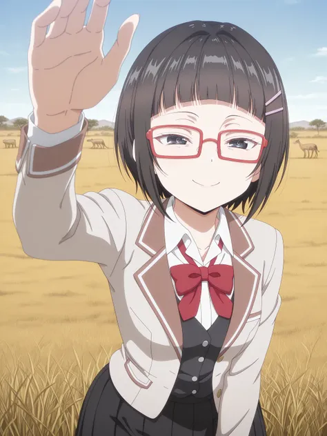 sayaka taniyama, black eyes, black hair, short hair, bangs, blunt bangs, hair clip, glasses, red-framed eyewear, mature female, small breasts, anime screencapshirt, bow, jacket, white shirt, collared shirt, bowtie, red bow, blazer, red bowtie, black skirt, pleated skirt,