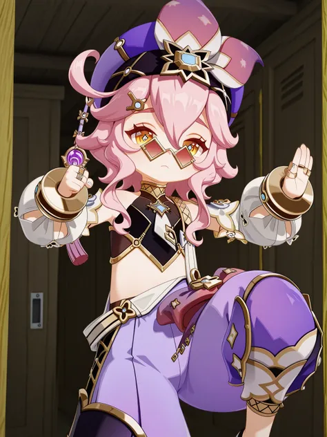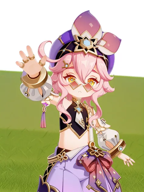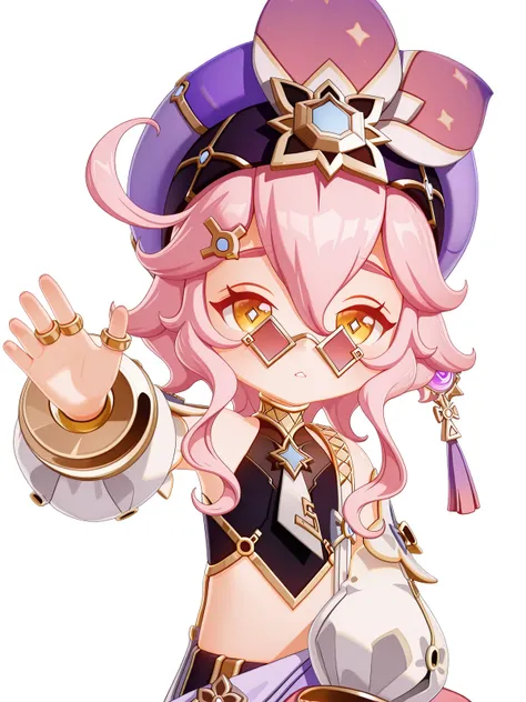 dori, dori (genshin impact), hair ornament, hair between eyes, yellow eyes, pink hair, ahoge, sidelocks, symbol-shaped pupils, sunglasses, short hair with long locks, 3dshirt, long sleeves, hair ornament, hat, jewelry, bare shoulders, detached sleeves, sleeveless, pants, puffy sleeves, midriff, stomach, bracelet, crop top, black shirt, sleeveless shirt, sunglasses, ring, puffy long sleeves, white sleeves, tinted eyewear, purple headwear, multiple rings, pince-nez, purple pants, puffy detached sleeves, arabian clothes, puffy pants, harem pants