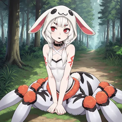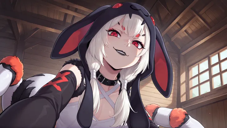 Cinny, 1girl, short hair, skirt, thighhighs, gloves, navel, cleavage, white hair, medium breasts, choker, pointy ears, elbow gloves, midriff, belt, hood, miniskirt, fingerless gloves, skindentation, thigh strap, red skirt, black choker, fishnets, animal hood, microskirt, tail ornament, tail bell, black lipstick, neck bell