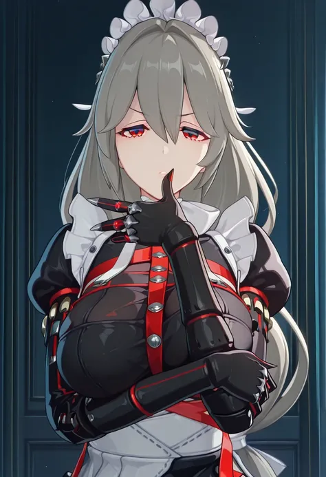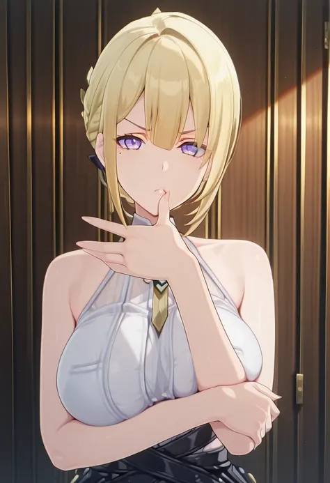 <lora:gotoubunnohanayome-vol7-illustriousxl-lora-nochekaiser:1>, gotoubunnohanayome vol7, solo, looking at viewer, upper body, parted lips, hand up, grabbing own arm, thumb on own lips, annoyed,