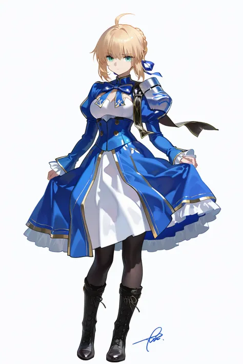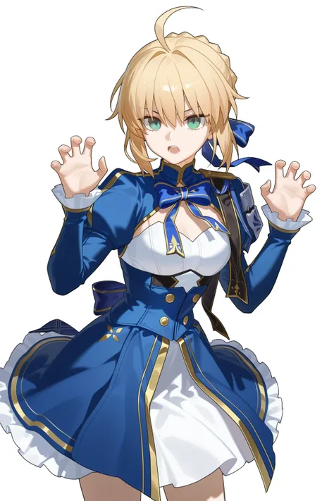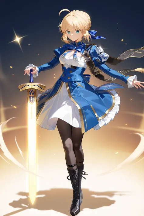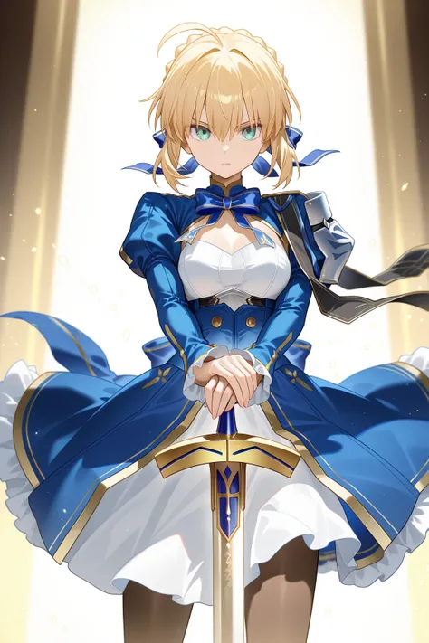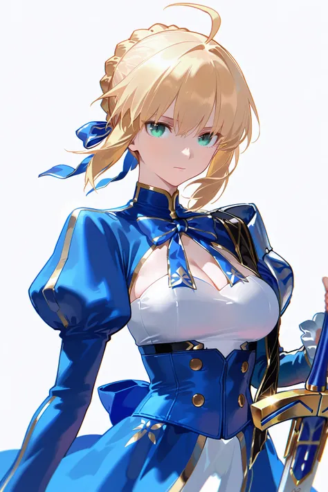 saber \(honkai star rail\) \(fate\), 1girl, green eyes, saber \(fate\), blonde hair, ahoge, dress, blue ribbon, white background, breasts, ribbon, long sleeves, braid, hair bun, shoulder armor, puffy sleeves, blue dress, hair ribbon, juliet sleeves, cleavage, bow, braided bun, blue bow,excalibur \(fate/stay night\), sword,weapon,