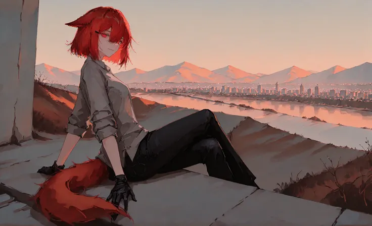 Crownslayer, animal ears, tail, red hair, short hair, hairclip, red eyes, bangs, hair between eyes,black jacket, hood, hood up, grey shirt, black jeans, mask, masked face, black gloves