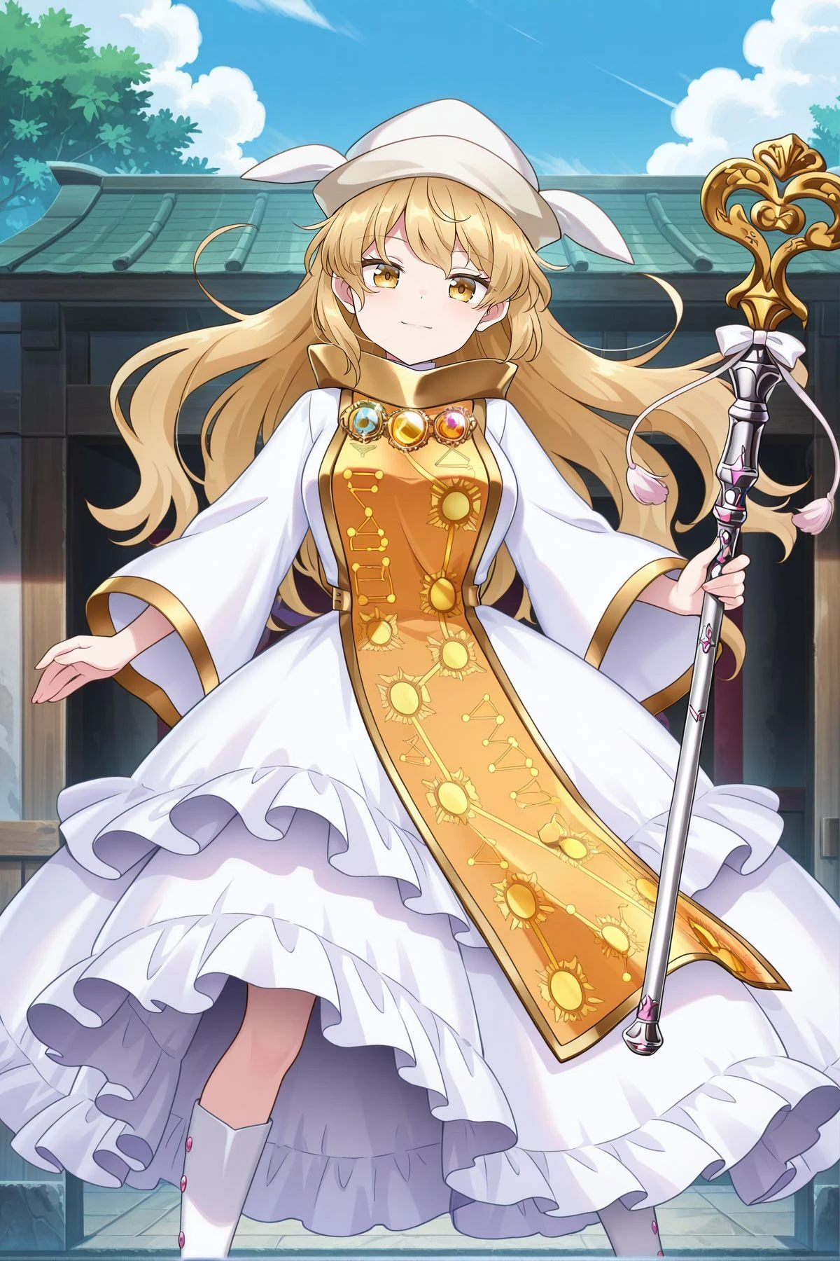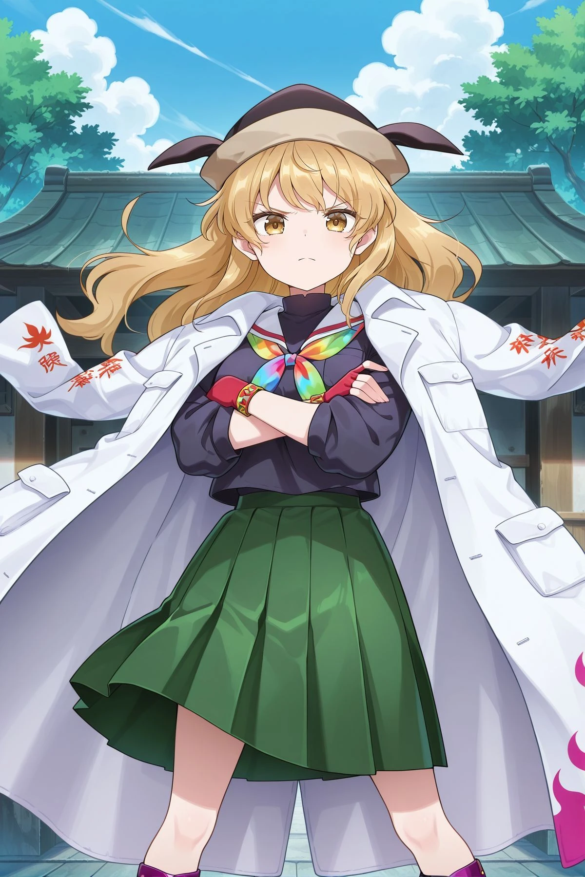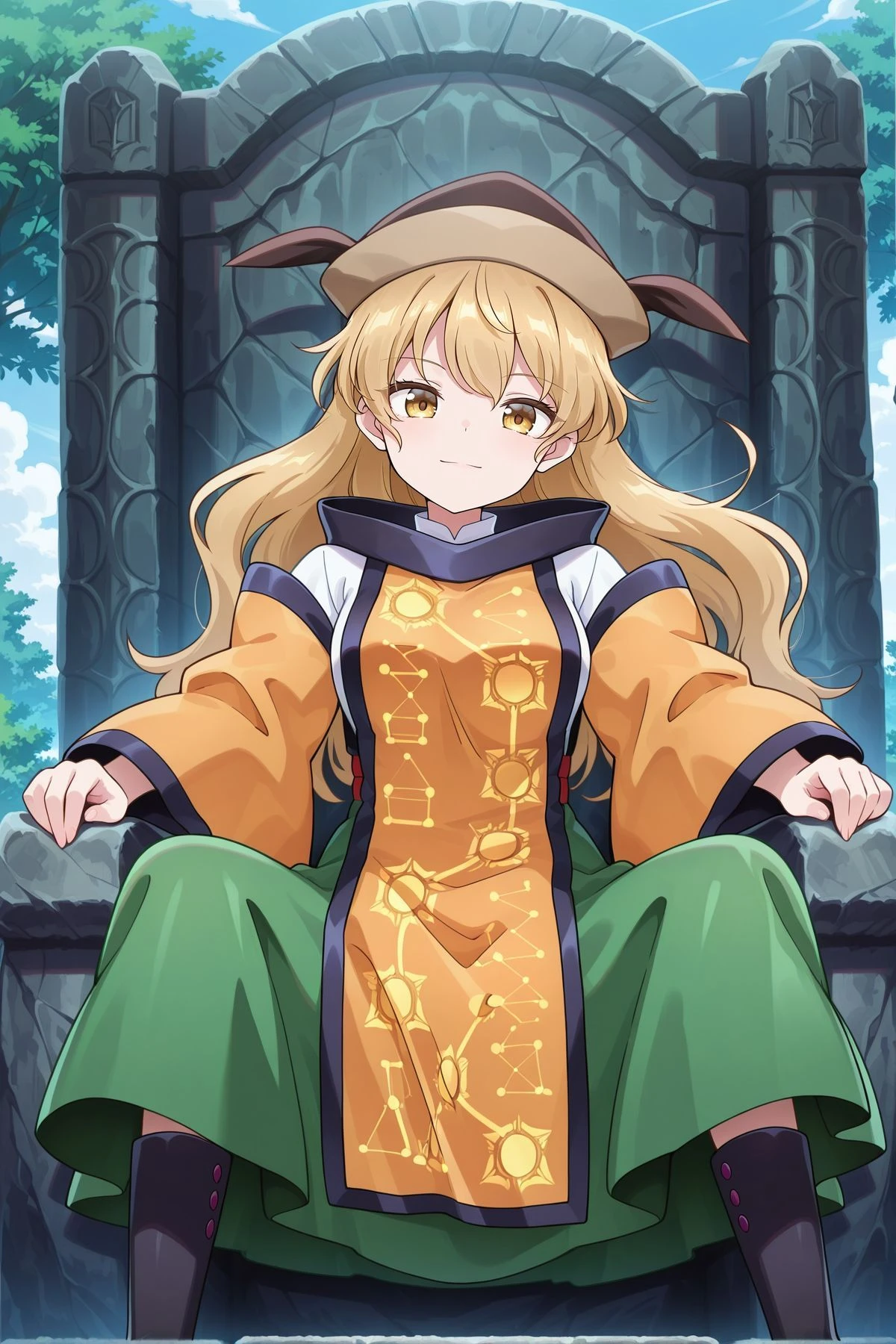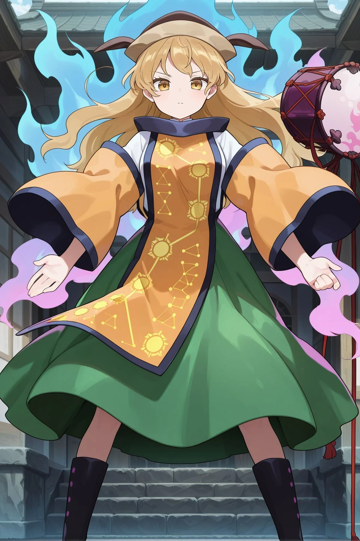 matara okina, 1girl, solo, yellow eyes, blonde hair, long hair,brown headwear, yellow tabard, constellation print, white shirt, long sleeves, wide sleeves, green skirt, black boots,tsuzumi, flying drum,sitting on throne,aura, flames,