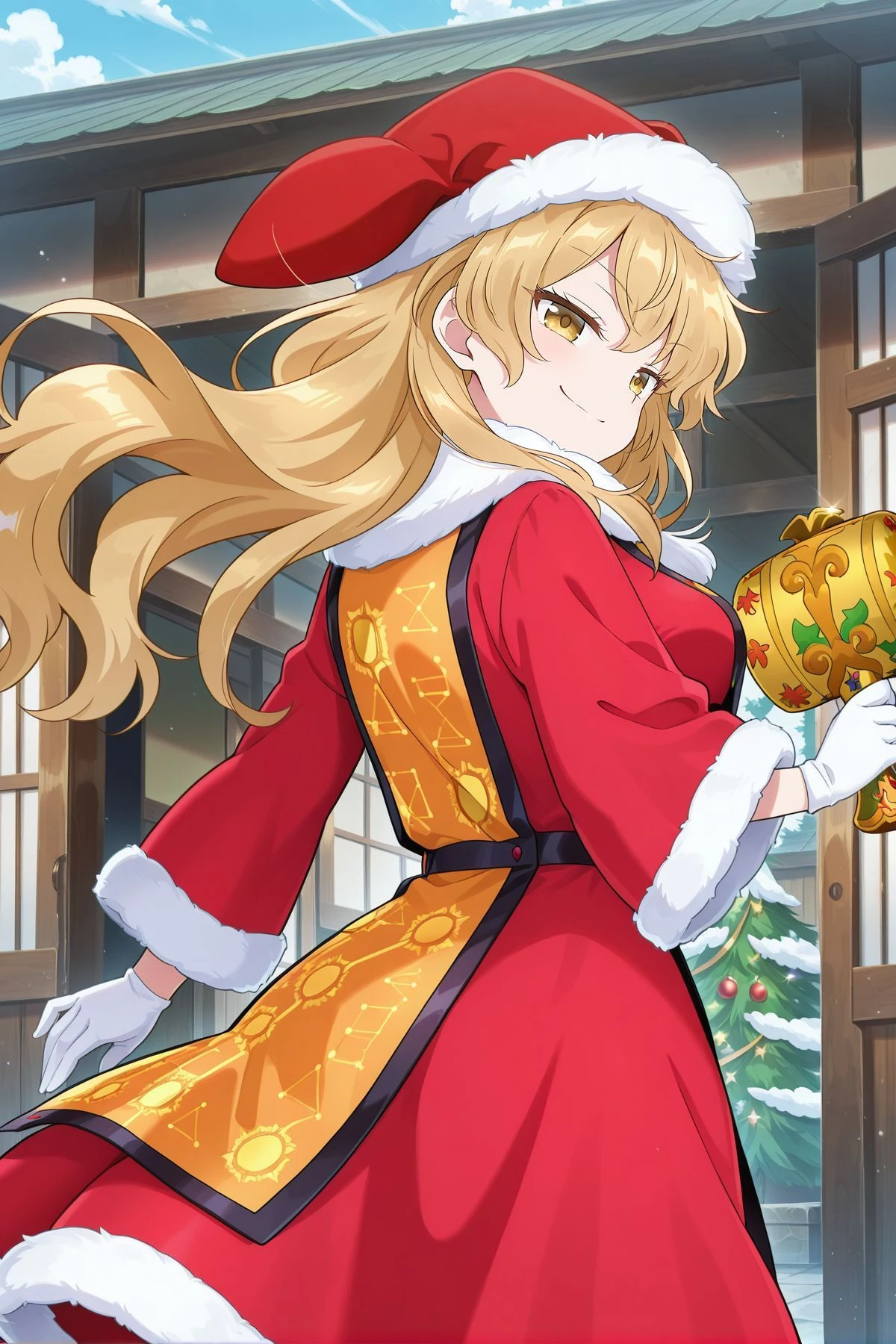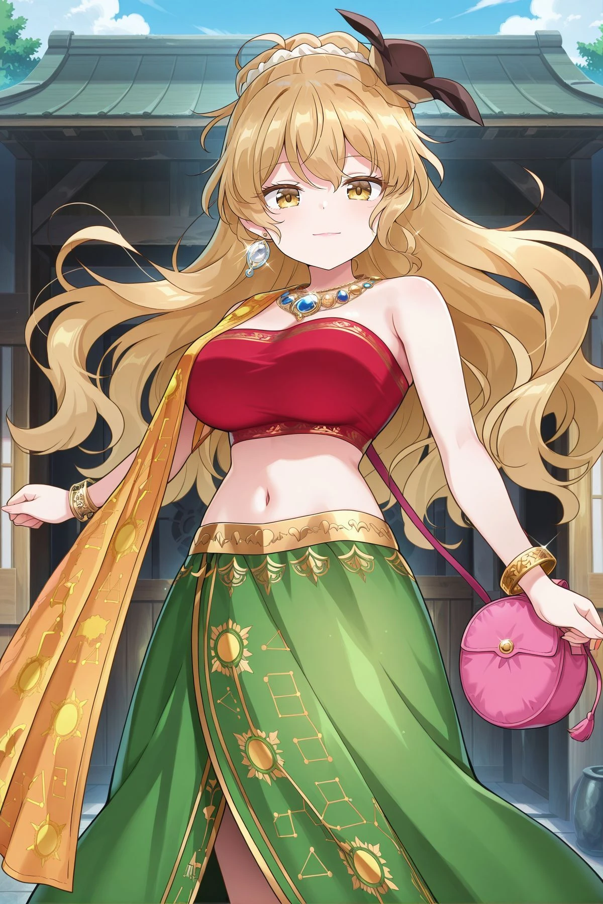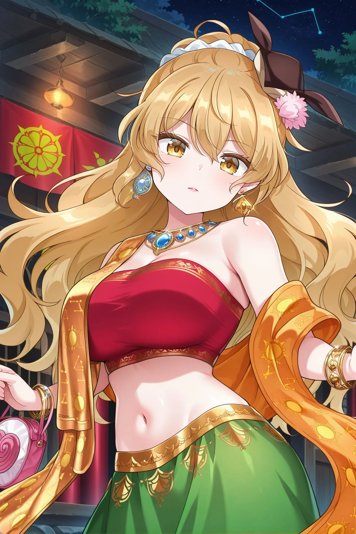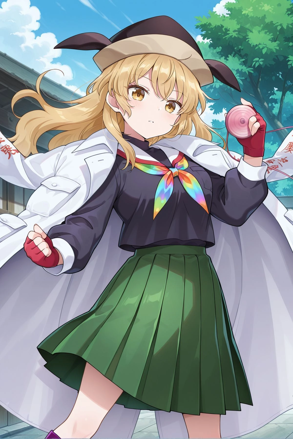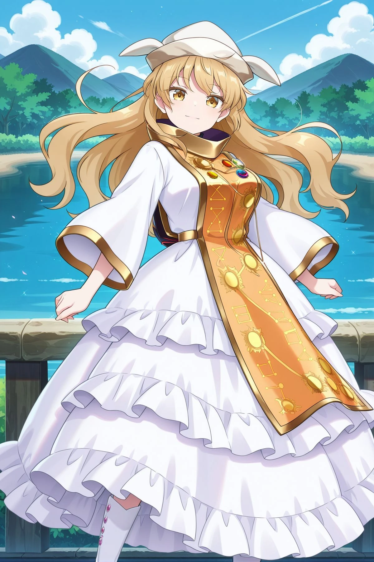 matara okina, 1girl, solo, yellow eyes, blonde hair, long hair,brown headwear, yellow tabard, constellation print, white shirt, long sleeves, wide sleeves, green skirt, black boots,tsuzumi, flying drum,sitting on throne,aura, flames,